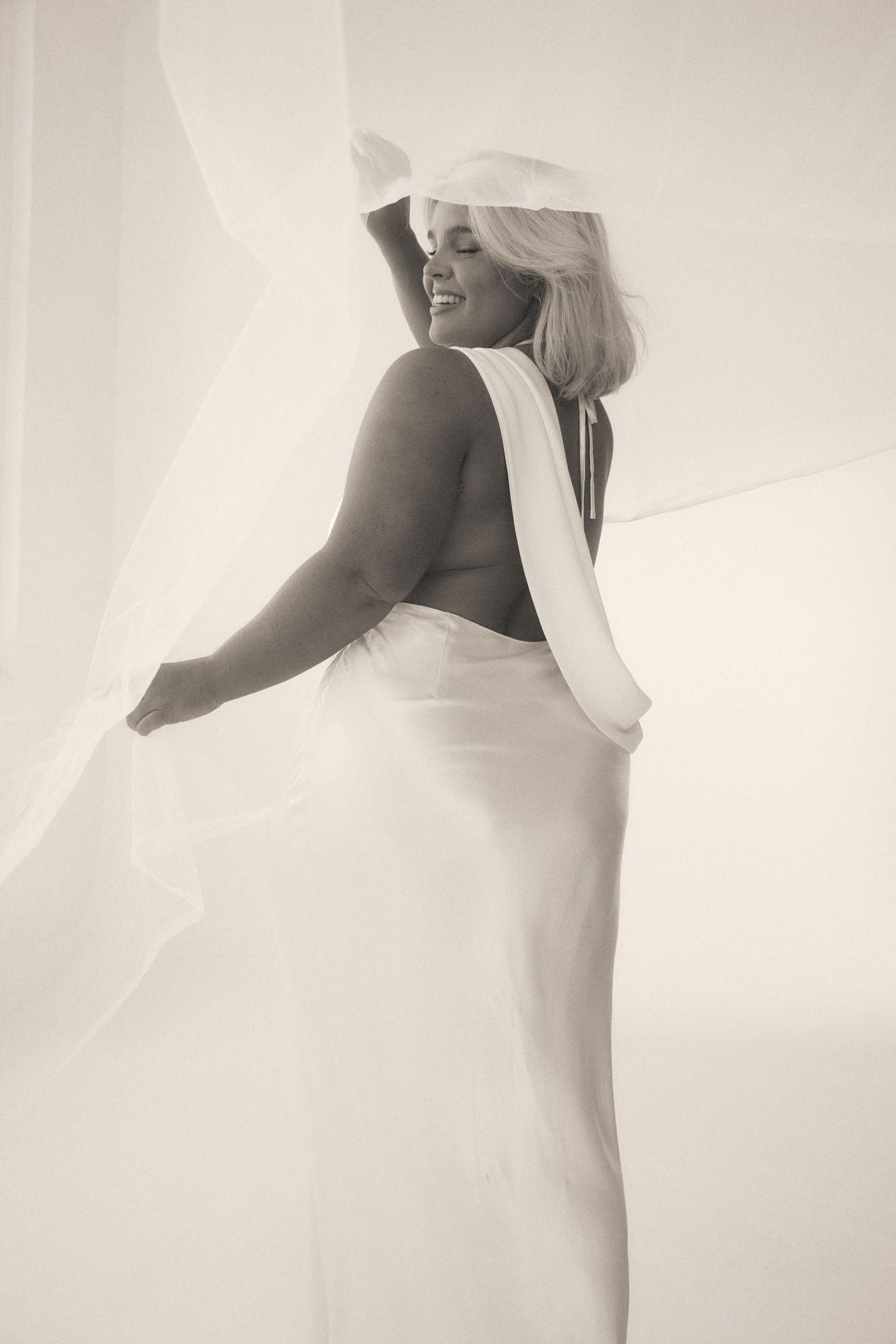 Plunging open back with contrast semi sheer chiffon drape across back.