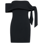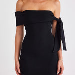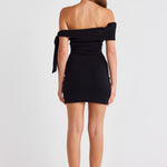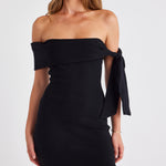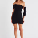 Folded off the shoulder feature with soft fixed tie at the arm. Please note the tie position may vary
