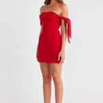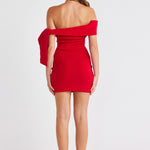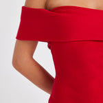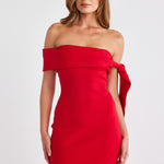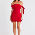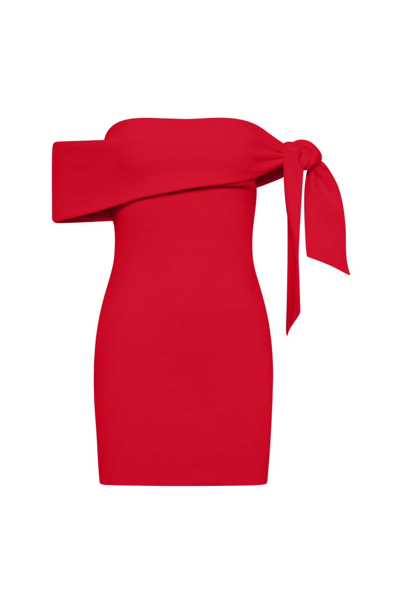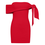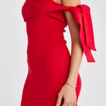 Folded off the shoulder feature with soft fixed tie at the arm. Please note the tie position may vary