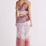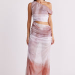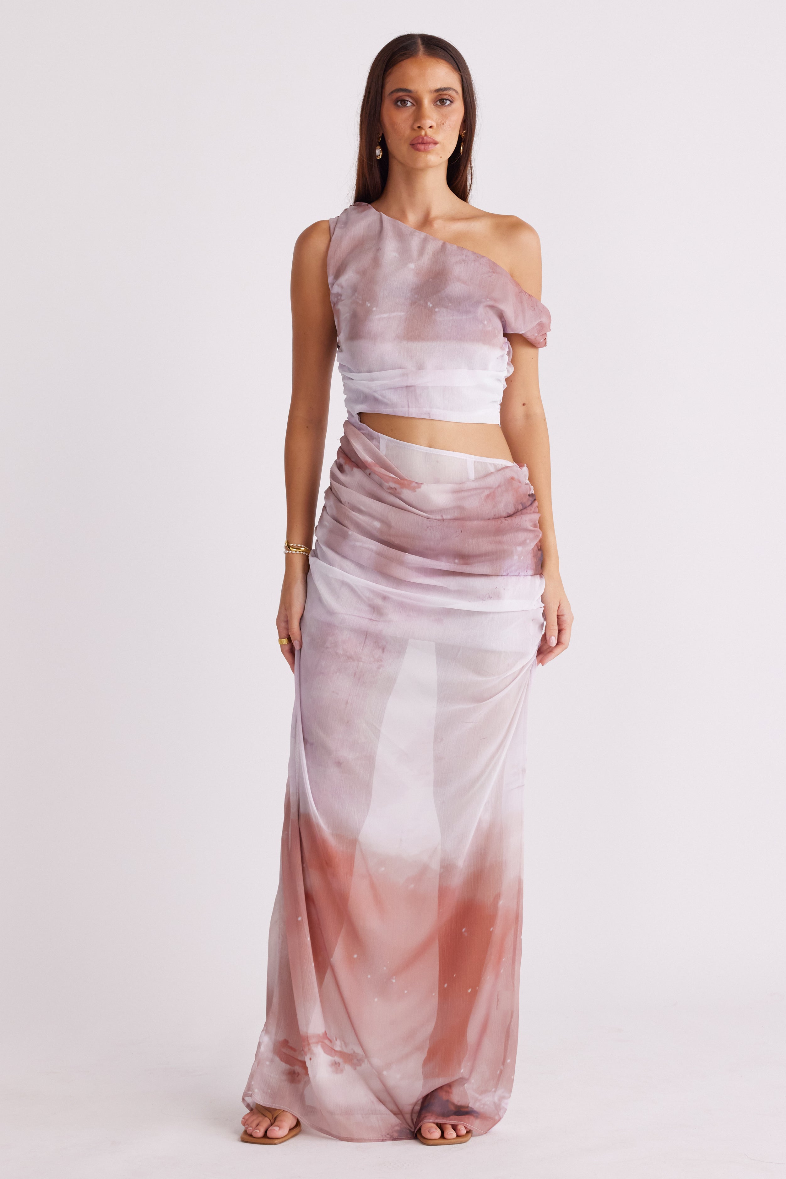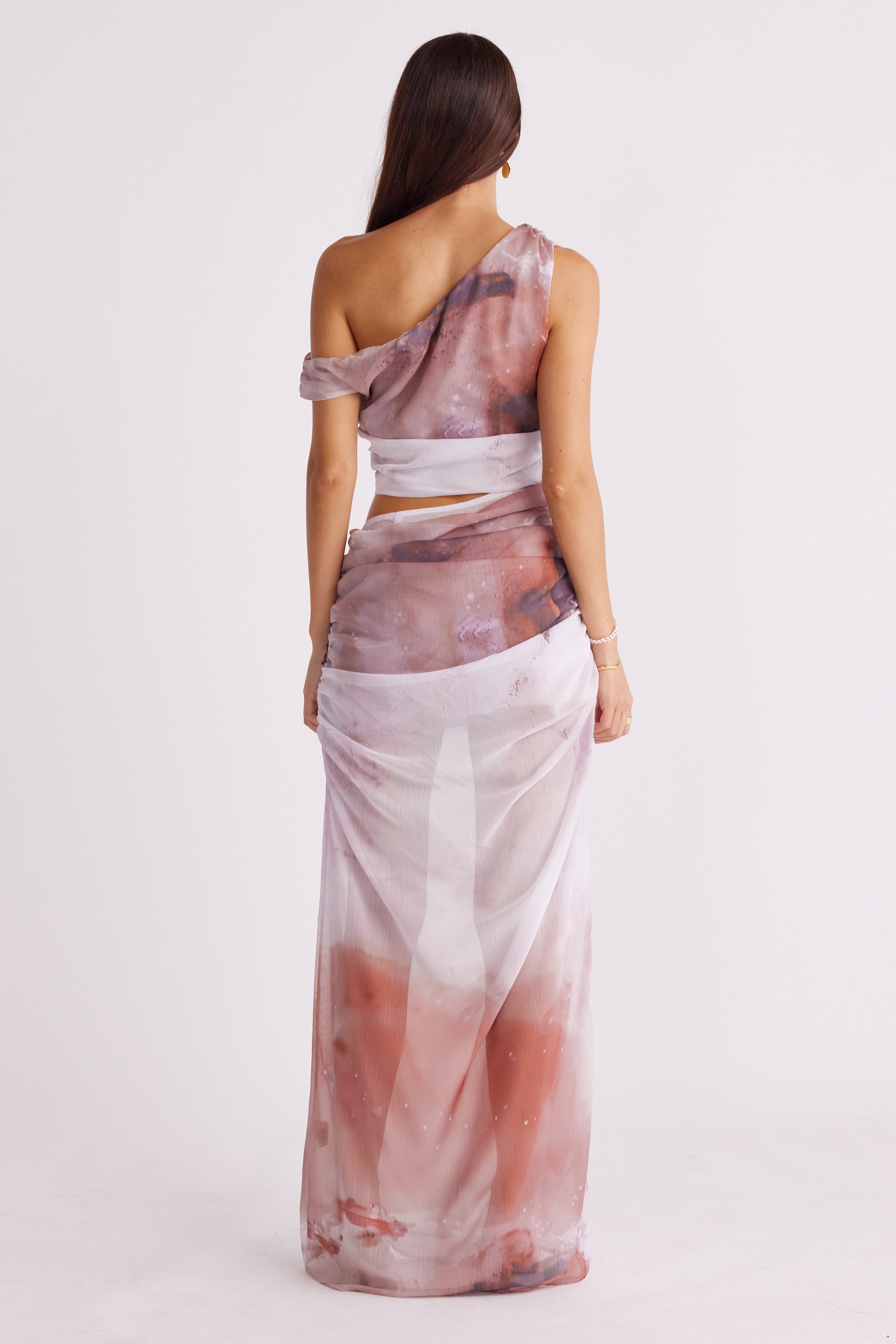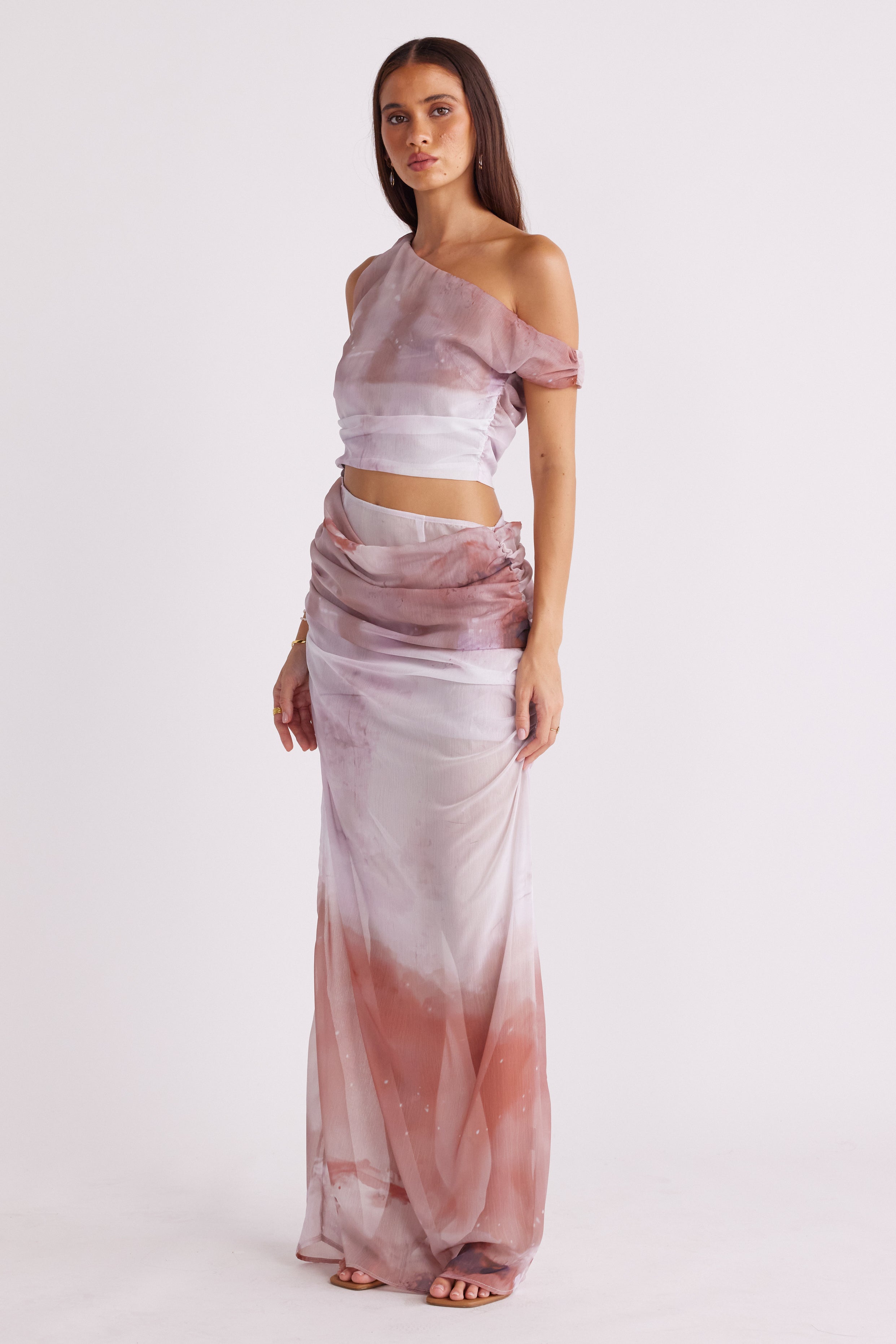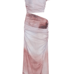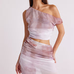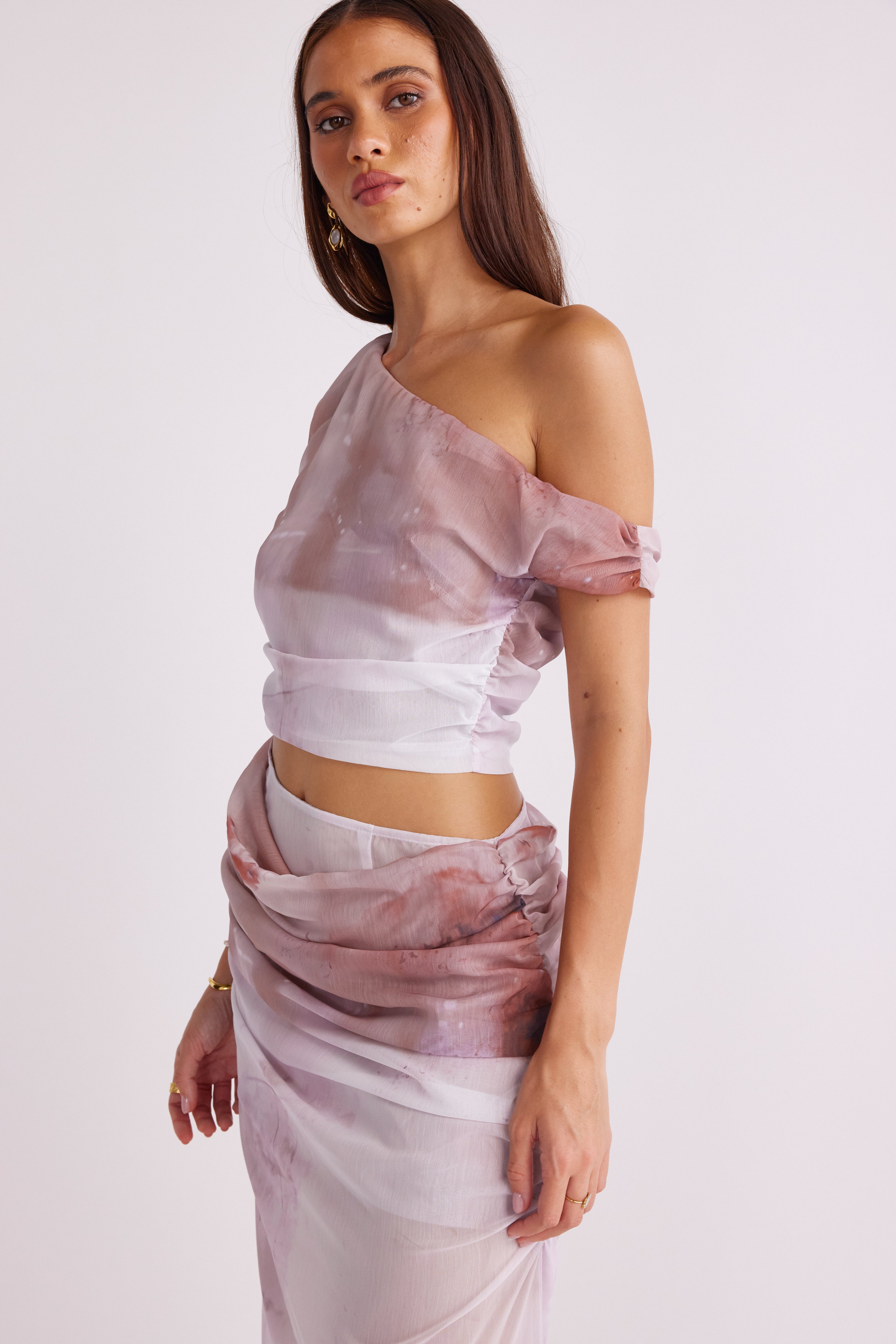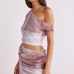 Asymmetrical off shoulder neckline with drape fold detailing on shoulder