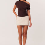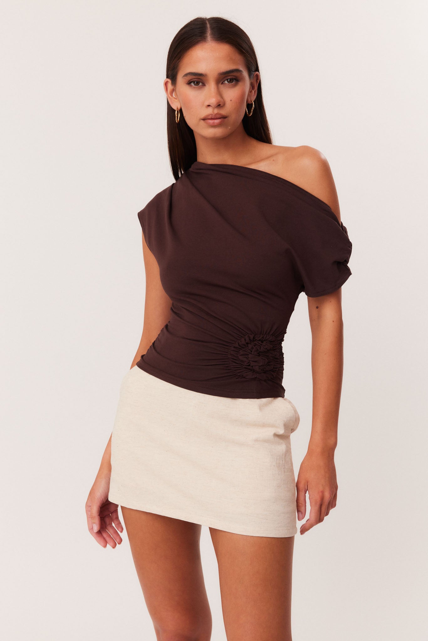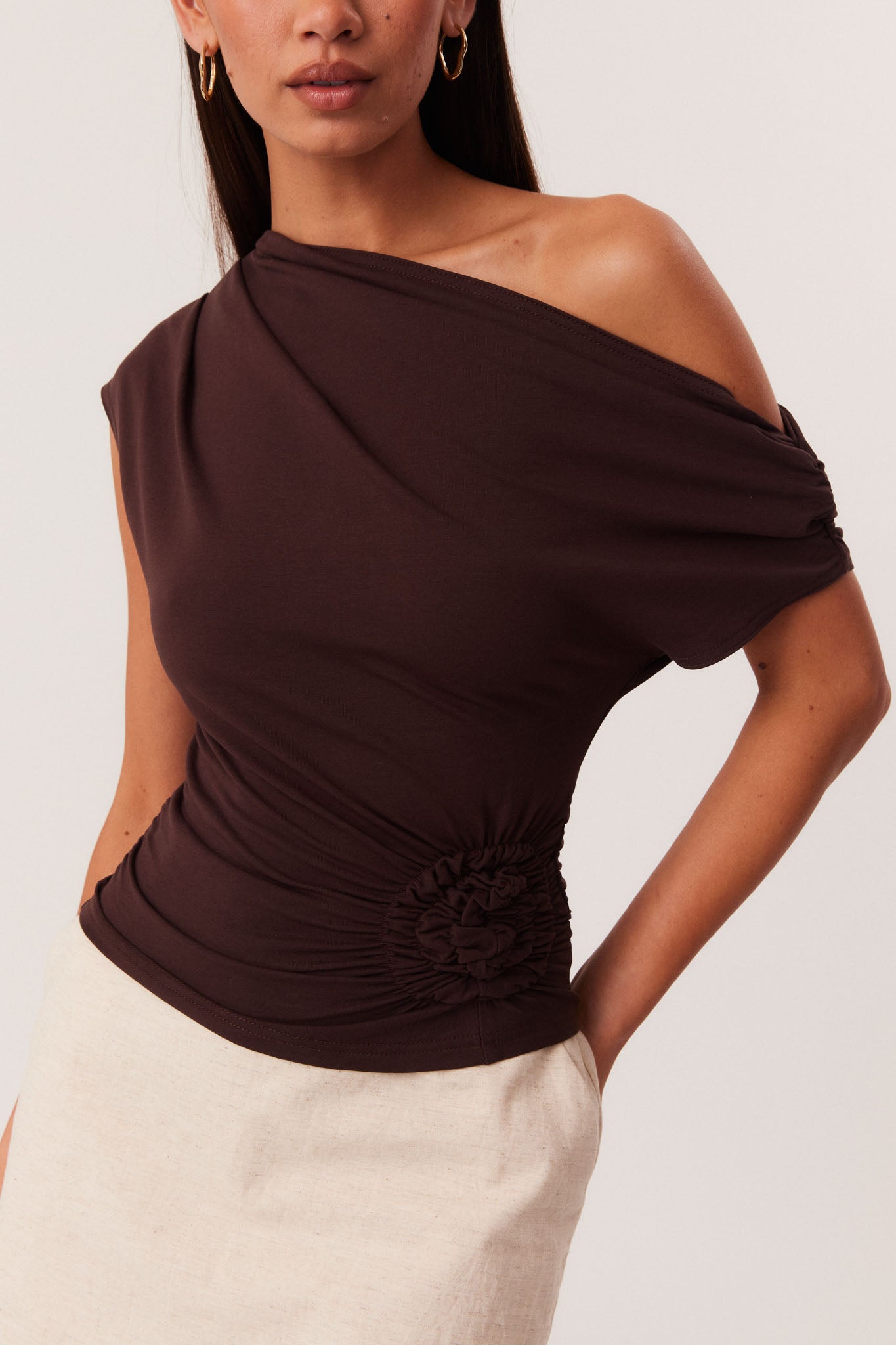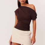 Asymmetrical neckline with shoulder seam gathers