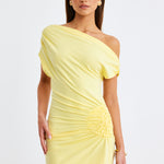 Asymmetrical neckline with shoulder seam gathers