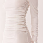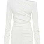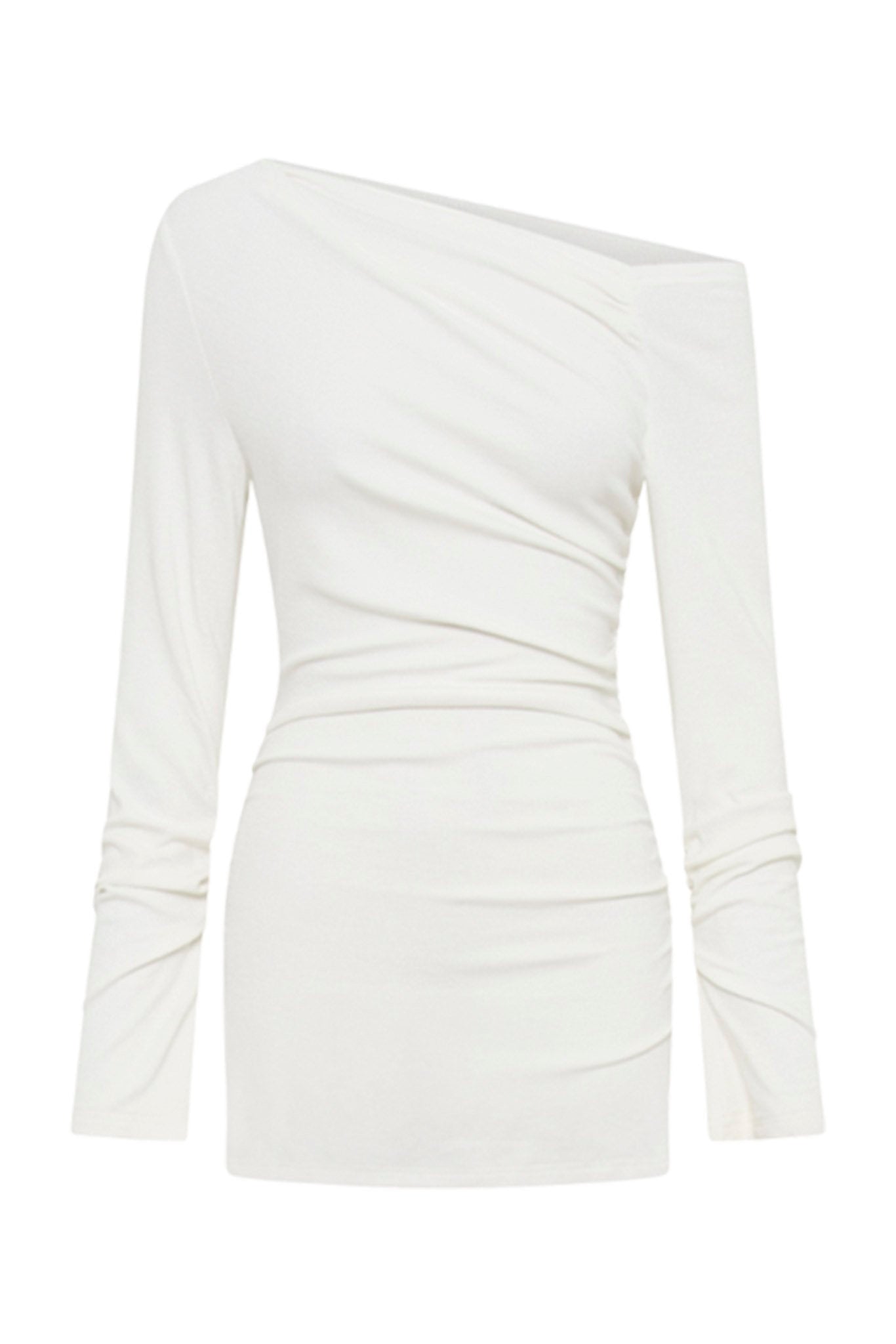 Singular off shoulder neckline with gathering along shoulder