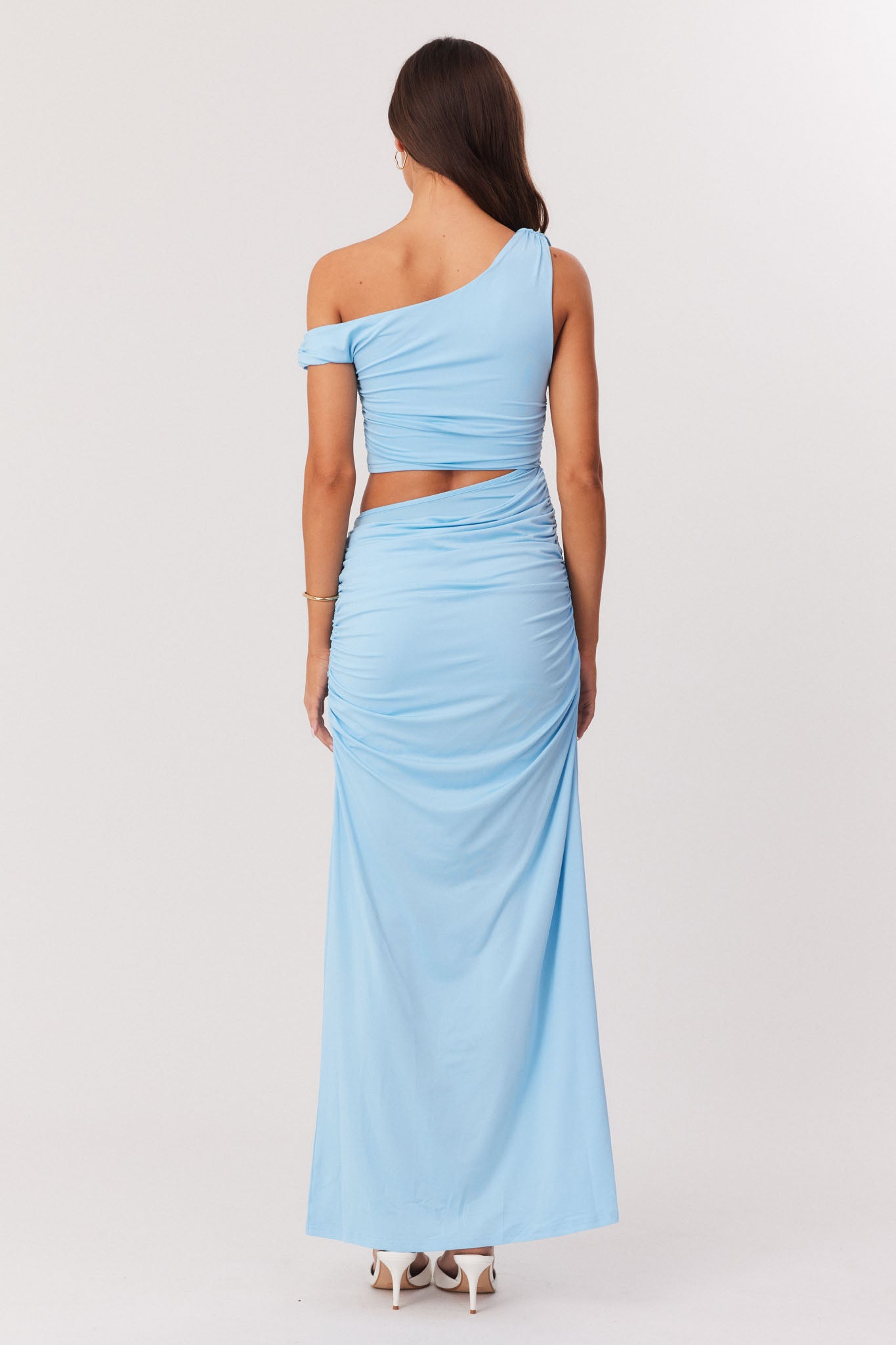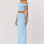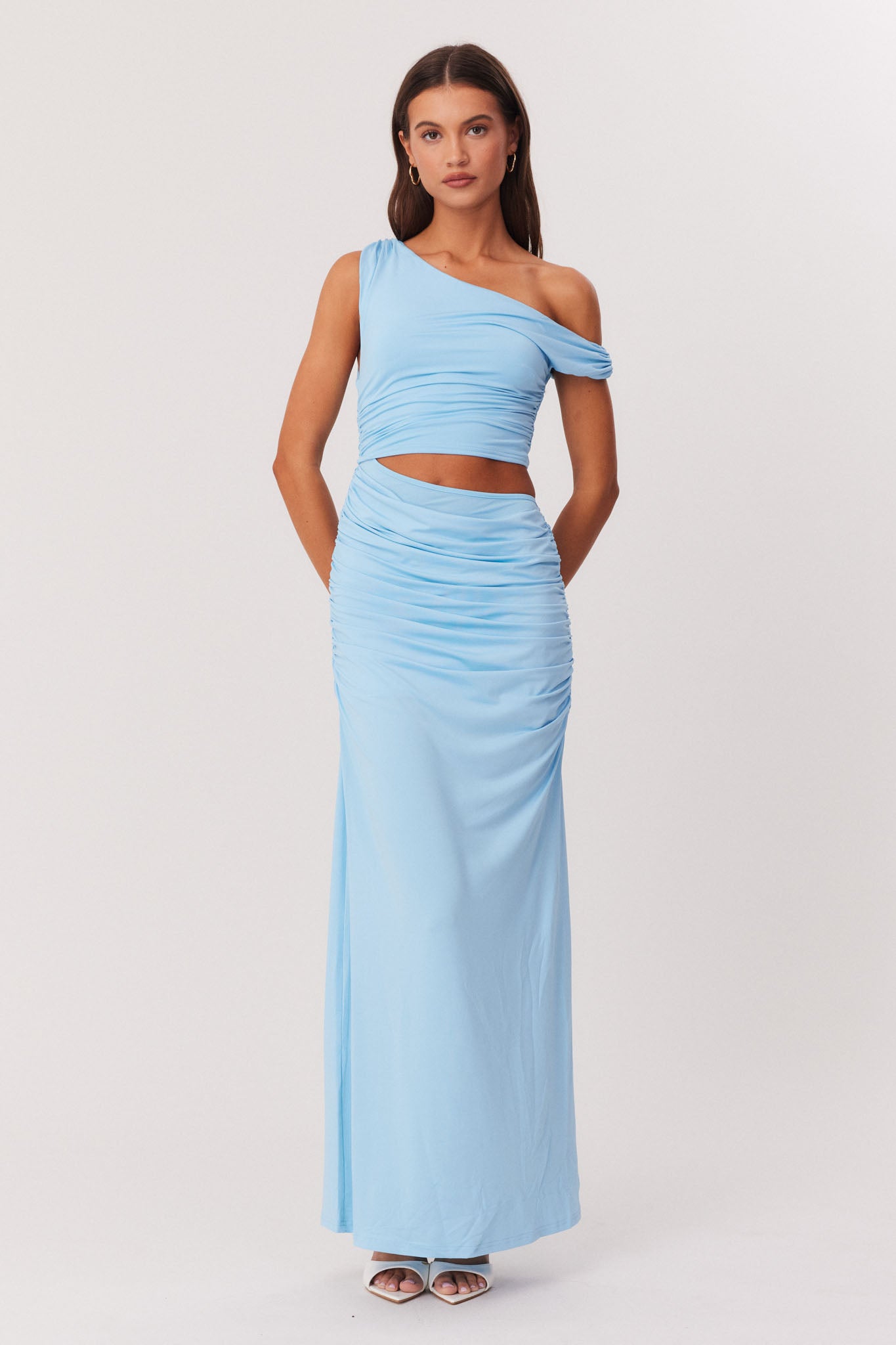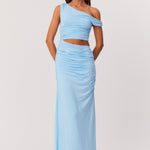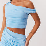 Asymmetrical off shoulder neckline with drape fold detailing on shoulder seam