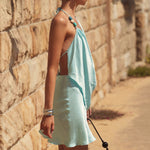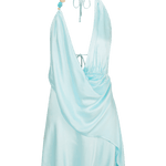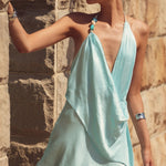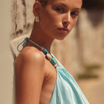 Stone shaped beads at neck drop down to soft cowl draped detail