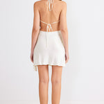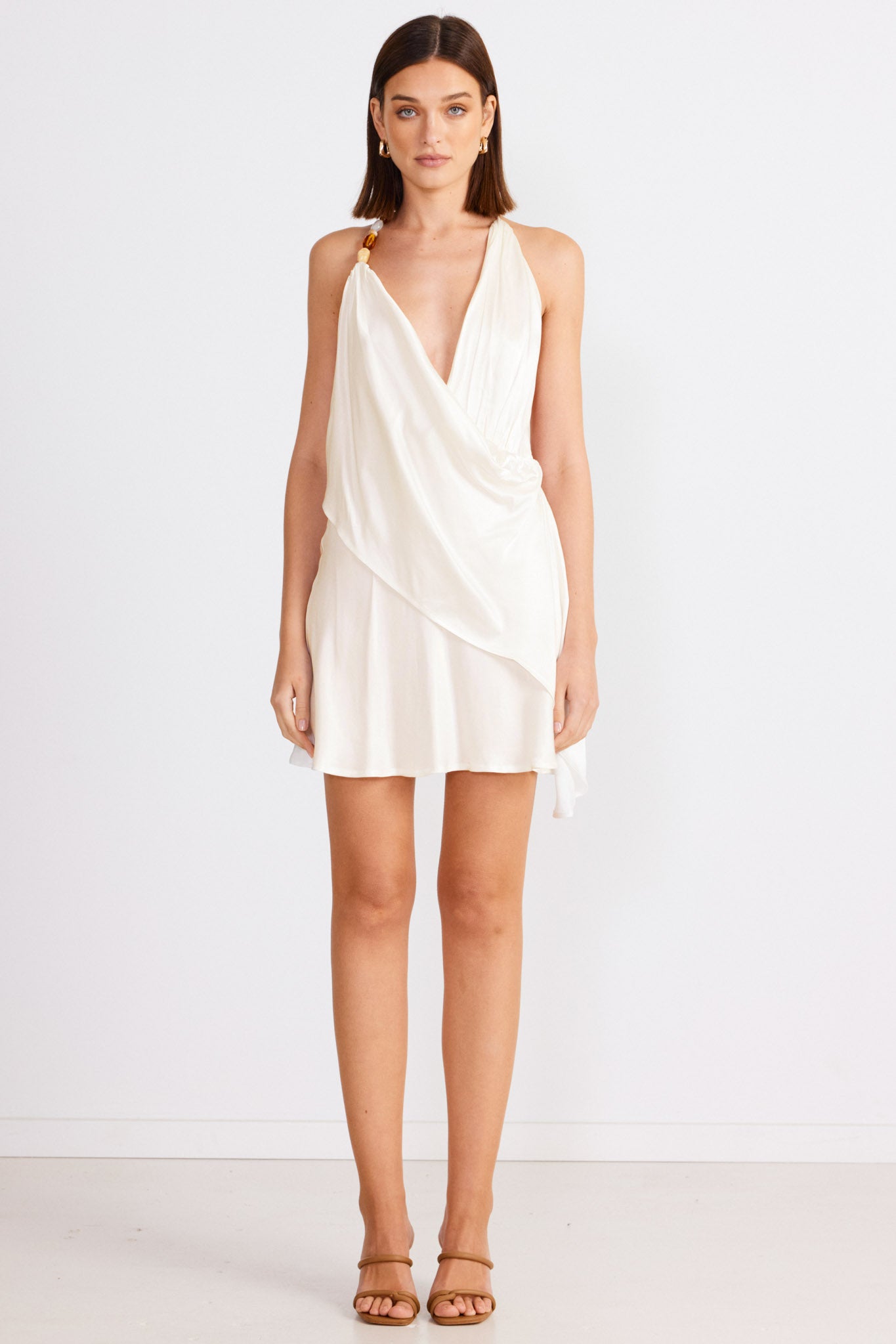 Stone shaped beads at neck drop down to soft cowl draped detail