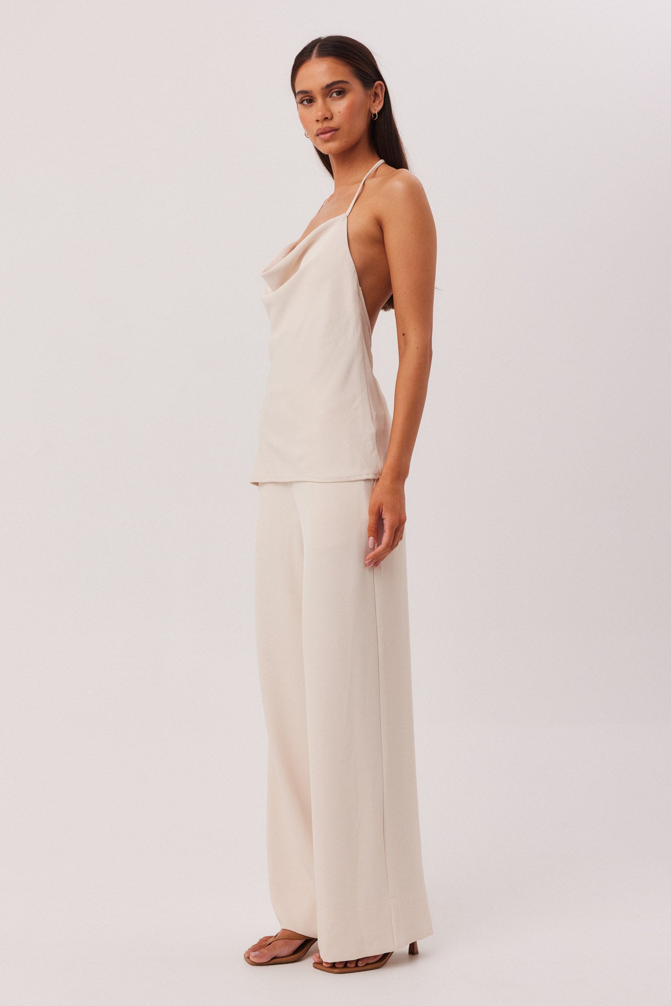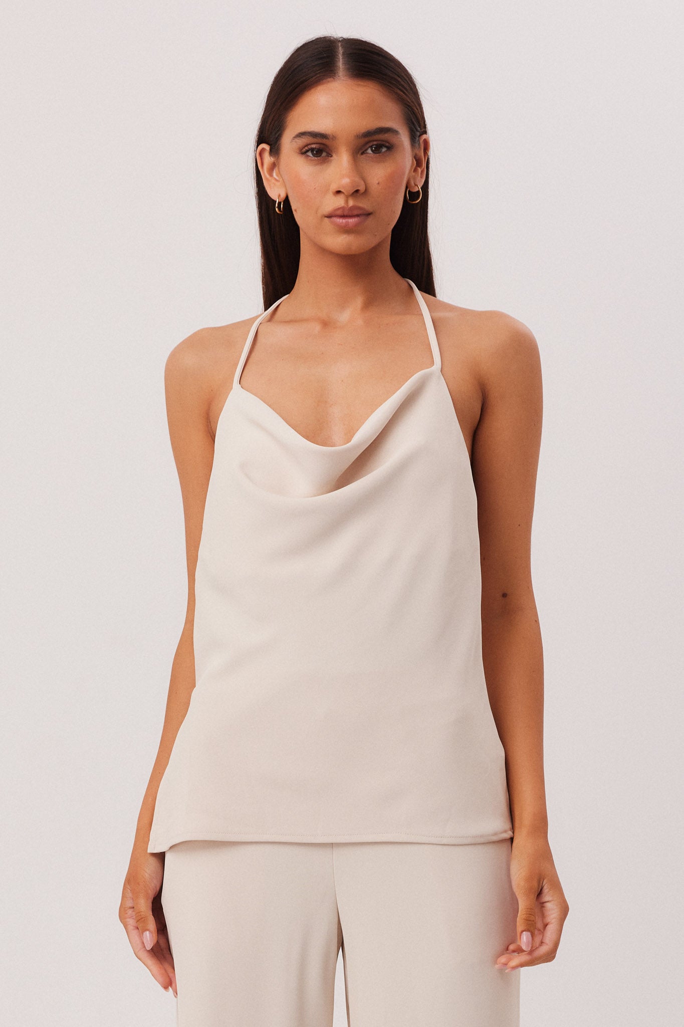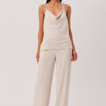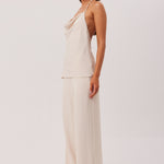 Soft cowl detail at neckline with adjustable halter neck tie