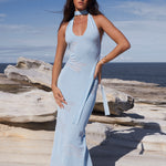 Adjustable halter neckline with extended tie that can be wrapped around the neck